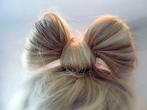 Jak na to: Rozčesané vlasy vyčešeme na horní část hlavy a uděláme culík. Poté si vezmeme další gumičku, kterou jednou obmotáme okolo culíku a při druhém obmotávání protáhneme vlasy, ale ne úplně celé - pouze do půlky a na hlavě nám vznikne "bochánek".Volný pramen, který nám zbyde zatím neřešíme a necháme ho být. Nyní se budeme zajímat o náš "bochánek", který uprostřed rozdělíme na dvě stejné poloviny. Každou polovinu se snažíme vytvarovat, aby vypadaly jako mašlička. Oba prameny upevníme sponkami. Když máme plus mínus mašličku vytvarovanou a drží, vezmeme si volný pramen (který nám zbyl při protahování gumičkou) a mezerou mezi prameny ho přehodíme dozadu a tam ho zasponkujeme. Mašličku máme hotovou, pouze ji dotvarujeme a přelakujeme :).